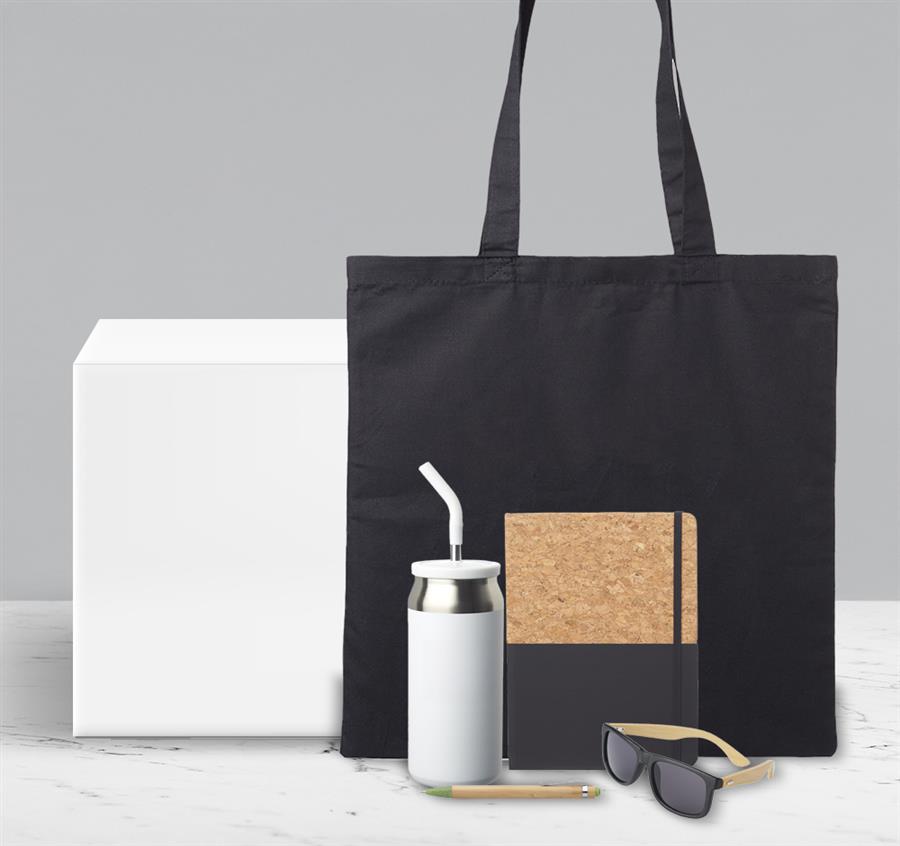 Assembled Eco-Friendly Starter Set Smart Kit, Pricing Includes1 Color Imprint on Each Item in The Box, Packing Box is White outside and Does Not Come Printed, Kit Includes 1 of Each Item listed: Tote Bag, Recycled Pen, Recycled Notebook, Travel Tumbler, Bamboo Glasses, and Packing Box. Colors of Items Cannot be Switched. |